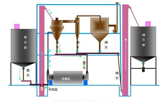 粉煤灰磨細(xì)、分選工藝說明:粉煤灰粉磨系統(tǒng)主要由原灰倉(cāng),葉輪給料器、電子計(jì)量稱、粉煤灰專用球磨機(jī)、選粉機(jī)、氣箱脈沖布袋除塵器、引風(fēng)機(jī)、螺旋輸送機(jī)、斗式提升機(jī)、給料機(jī)、控制系統(tǒng)等組成。系統(tǒng)直接由原灰倉(cāng)下取灰,經(jīng)葉輪給料器給料,電子稱稱重后由螺旋輸送機(jī)輸送進(jìn)入磨尾提升機(jī),粉煤灰由提升機(jī)喂入選粉機(jī)進(jìn)行磨細(xì)前的分選,分選后的粗灰經(jīng)螺旋輸送機(jī)送入磨機(jī)進(jìn)料口,進(jìn)入球磨機(jī)研磨,經(jīng)磨機(jī)研磨后的物料中含有大量細(xì)灰,再次由提升機(jī)喂入選粉機(jī)分選,分選出的細(xì)灰經(jīng)后續(xù)螺旋輸送機(jī)送入成品灰?guī),磨機(jī)通風(fēng)除塵與選粉機(jī)細(xì)粉布袋除塵器共用;采用此種閉路研磨工藝與開路(無選粉機(jī))系統(tǒng)相比可提高臺(tái)時(shí)產(chǎn)量30~40%以上。